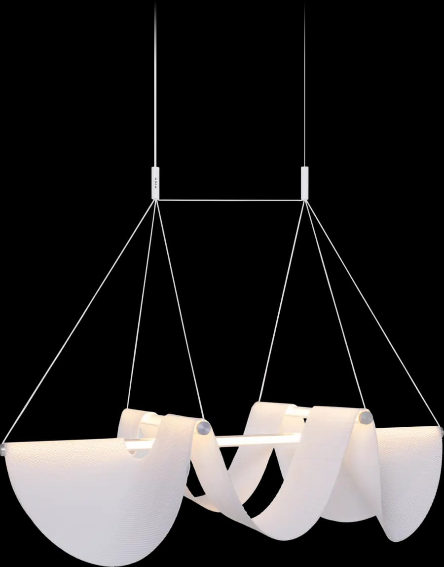 Shaped by gravity, the 3D-knitted polyester fabric rests on a minimal frame of two glass tubes encapsulating LED lights.