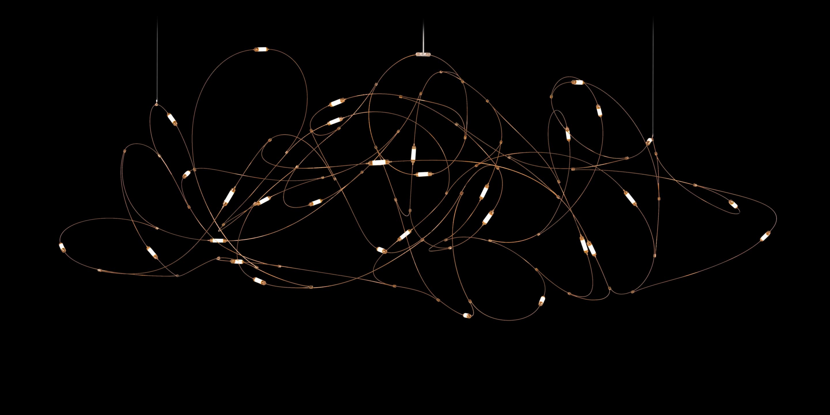 Bronze wires lead to brass cups that hold the semi-transparent polycarbonate diffusers with LEDs that bring a poetic glow of twilight into your home, which will last as long as you live there.