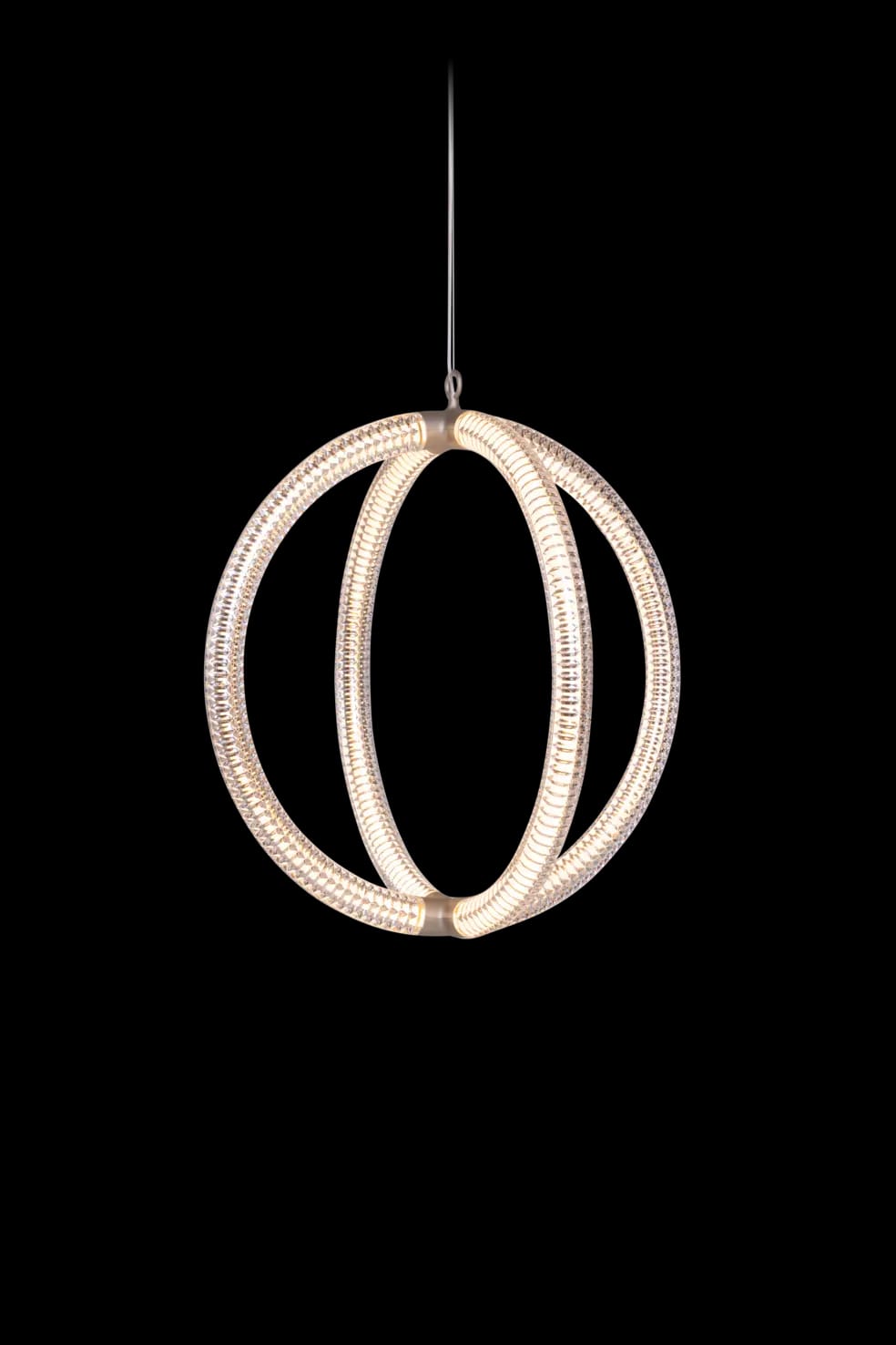 Two steel spheres, interconnected with LEDs, form a thin and openwork triangular mesh that transport the electric current.