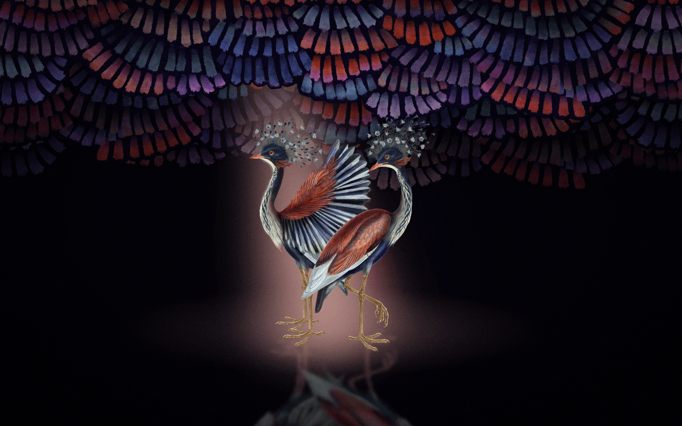 The most spectacular feature of the Cranes was not their crowns, but their unique colouration and fan-like wings. Fiery red and burned orange contrasted with the deep blue feathers and crown. The uncommon pleating of their fan-like wings not only looked beautiful; it gave the cranes unmatched speeds in the sky. When unfolding their wings, it even sounded like a pleated paper fan spreading out.