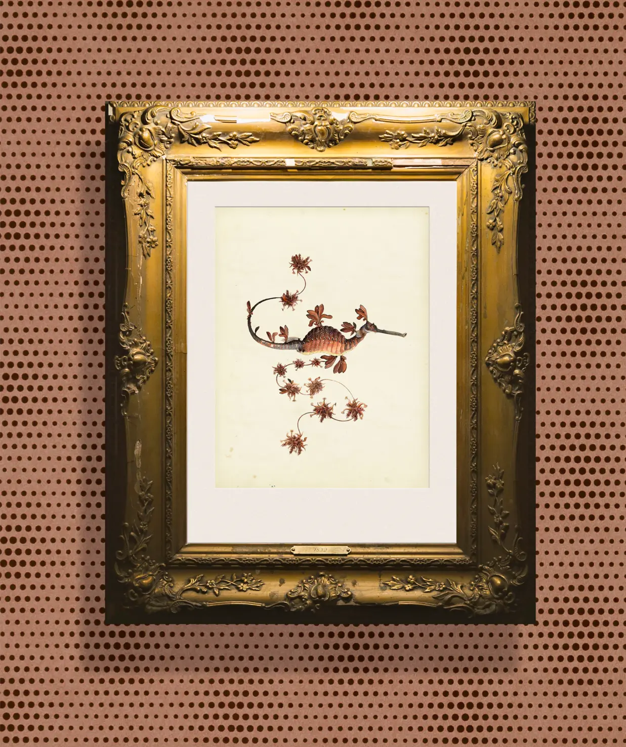 Printed wallcovering with a flock finish inspired by the mysterious Blooming Seadragon, who evolved spectacular leaf-like appendages in yellow, brown and green as a clever camouflage.