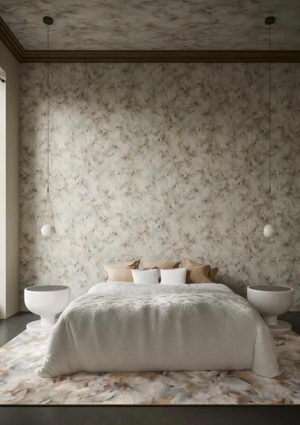 The delicate watercolour-like floral design and fil-à-fil texture create a luxurious, soft pastel backdrop for modern interiors.