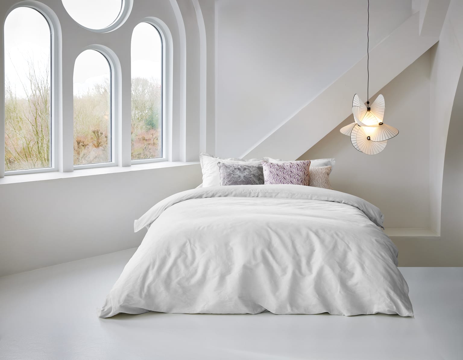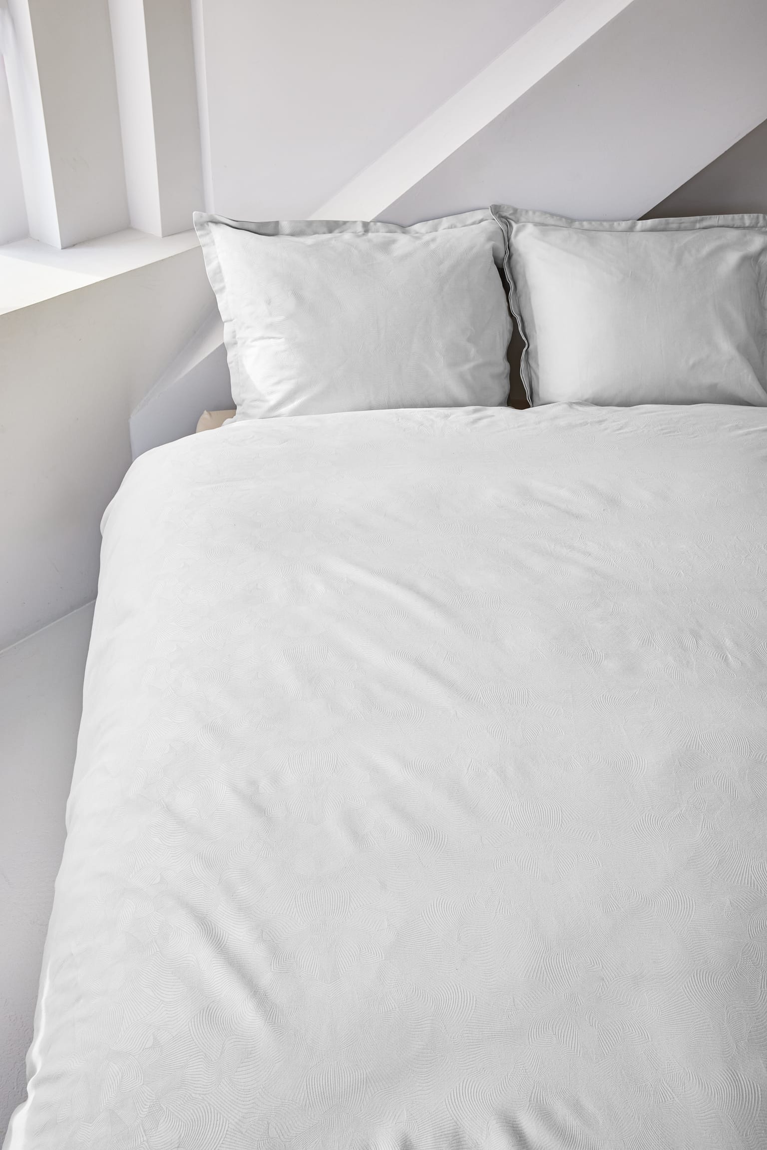 The Techno Bee Duvet Cover Set is part of Moooi's Green House Bedding Collection. The Duvet Cover Set features a subtle white-on-white jacquard weave on the front, based on the rhythmic patterns the Techno Bee creates with its wings. The back is made of 100% cotton satin (300 TC). This means that extra-fine yarns have been used, giving the cover an extra soft and smooth feel.