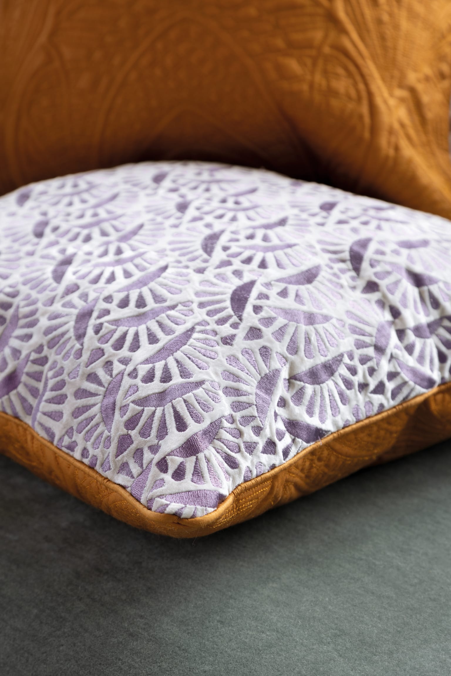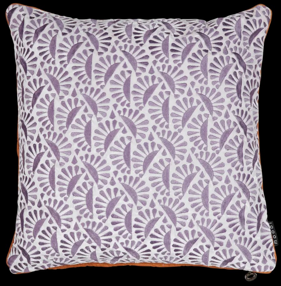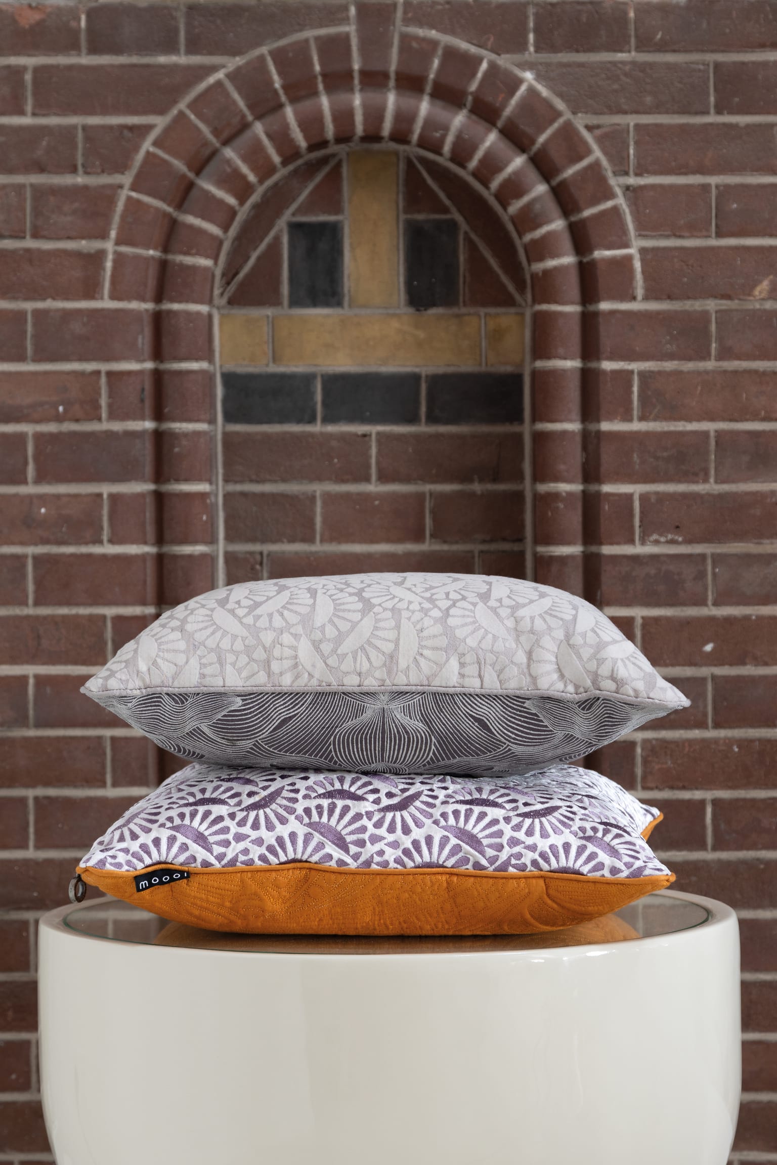 The Woodblock Beetle Decorative Pillow is part of Moooi's Green House Bedding Collection. The embroidered pattern on the front has mauve and light grey colours. The quilted back is ochre/peach. All around, the decorative cushion is finished with a satin piping, giving it a luxurious look and feel. Insert sold separately