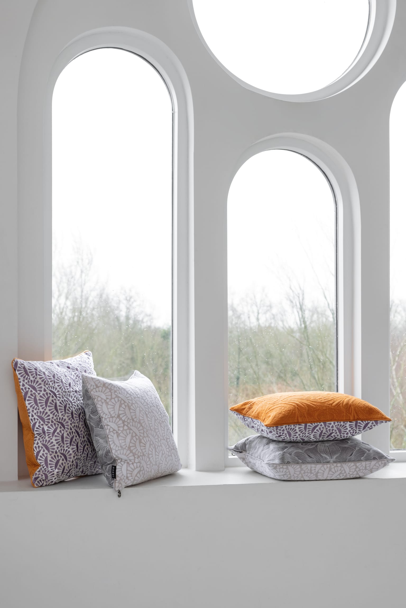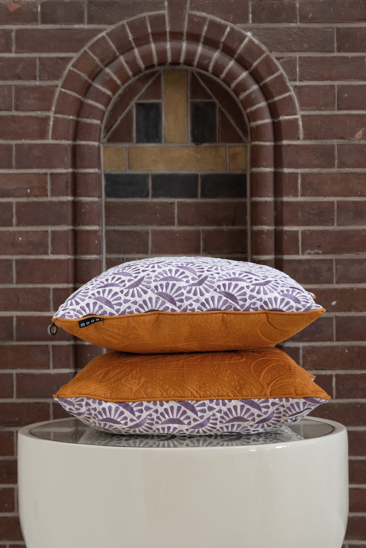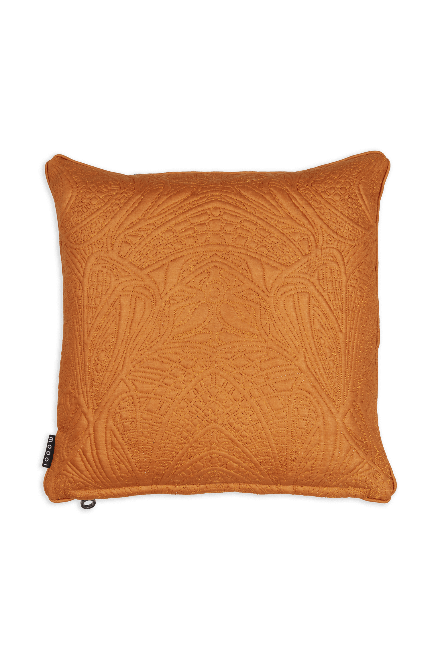 The Woodblock Beetle Decorative Pillow is part of Moooi's Green House Bedding Collection. The embroidered pattern on the front has mauve and light grey colours. The quilted back is ochre/peach. All around, the decorative cushion is finished with a satin piping, giving it a luxurious look and feel. Insert sold separately