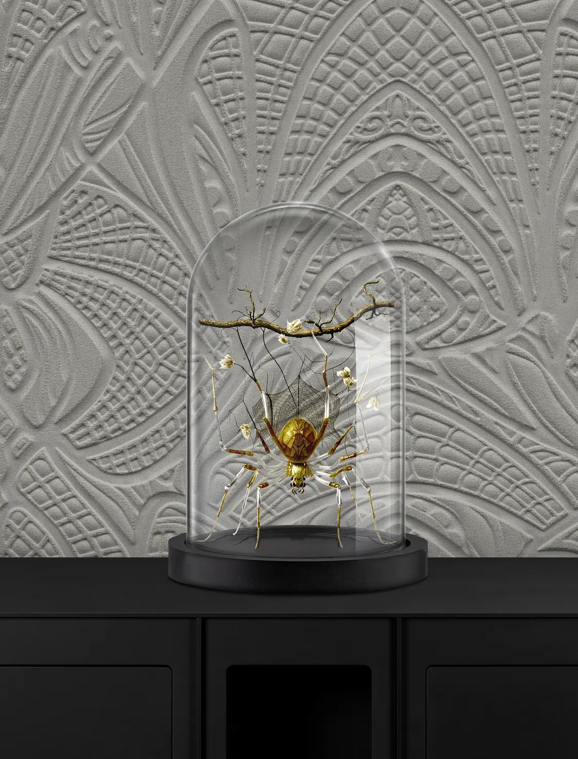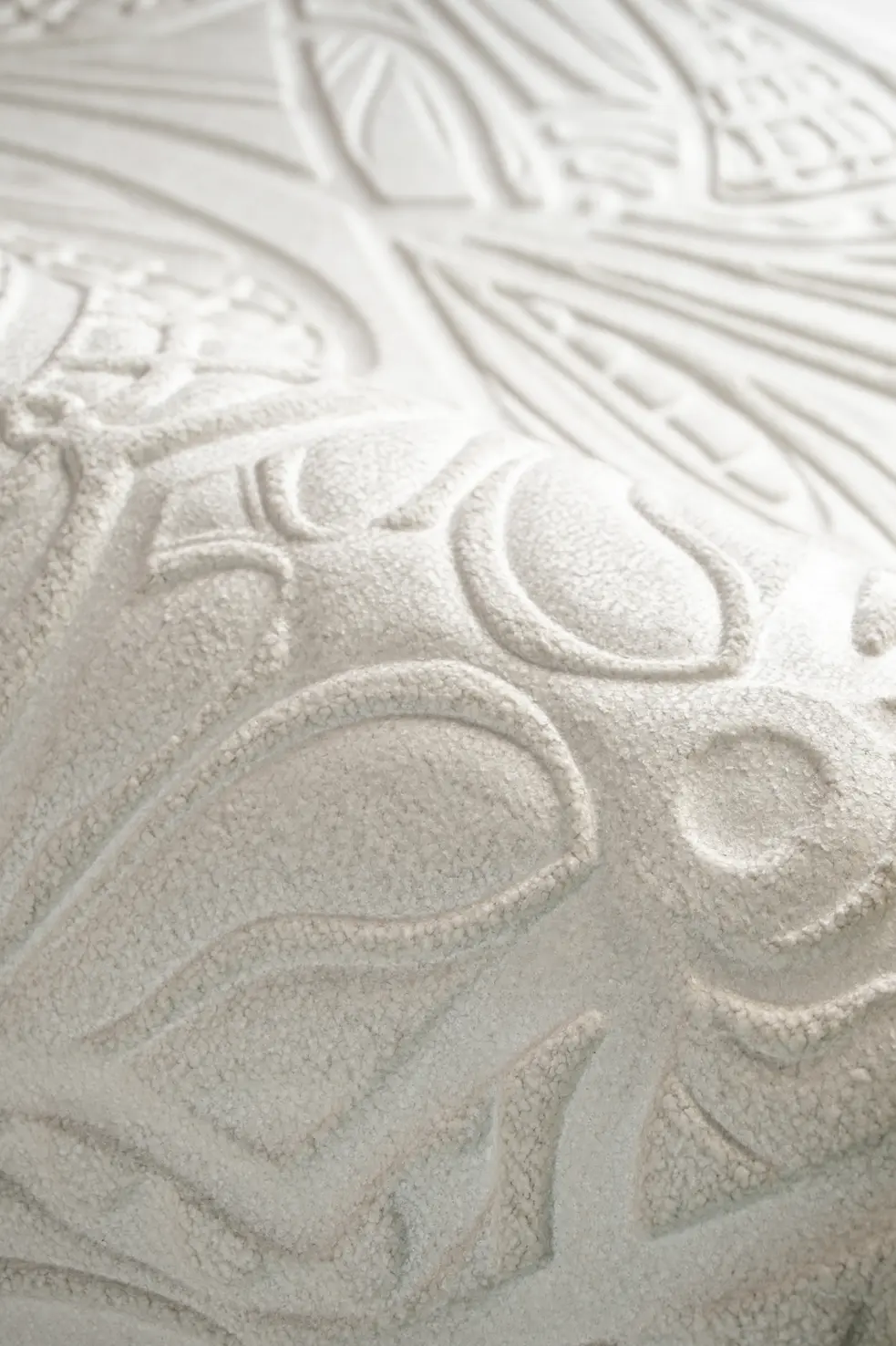 The Lacy Longlegs Wallcovering is a 3D textile wallcovering on non-woven backing. This tactile wallcovering creates a soft, three-dimensional effect courtesy of the boucle fabric. The design takes inspiration from the spider’s intricate weaves, preferred leaves, and Gothic arches.
