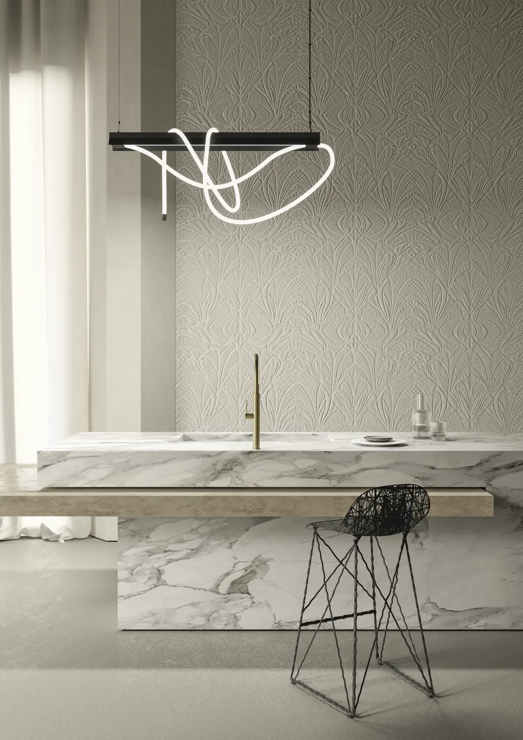 Gothic-inspired patterns and natural weaves create a rich, dynamic surface, adding depth and character to modern spaces.
