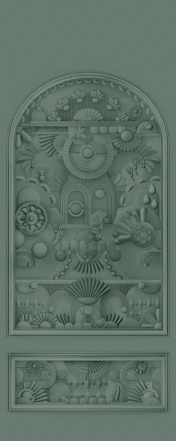 The Greenhouse Gathering Wallcovering is a stunning 3D wall covering that draws inspiration from decorative moulding. The design imitates the sensation of peering through the glass panels of a Green House, uncovering the mesmerising marvels of lush flowers with many intricacies. Infused with the charm of art deco, the Greenhouse Gathering Wallcovering comes in a monochrome palette.