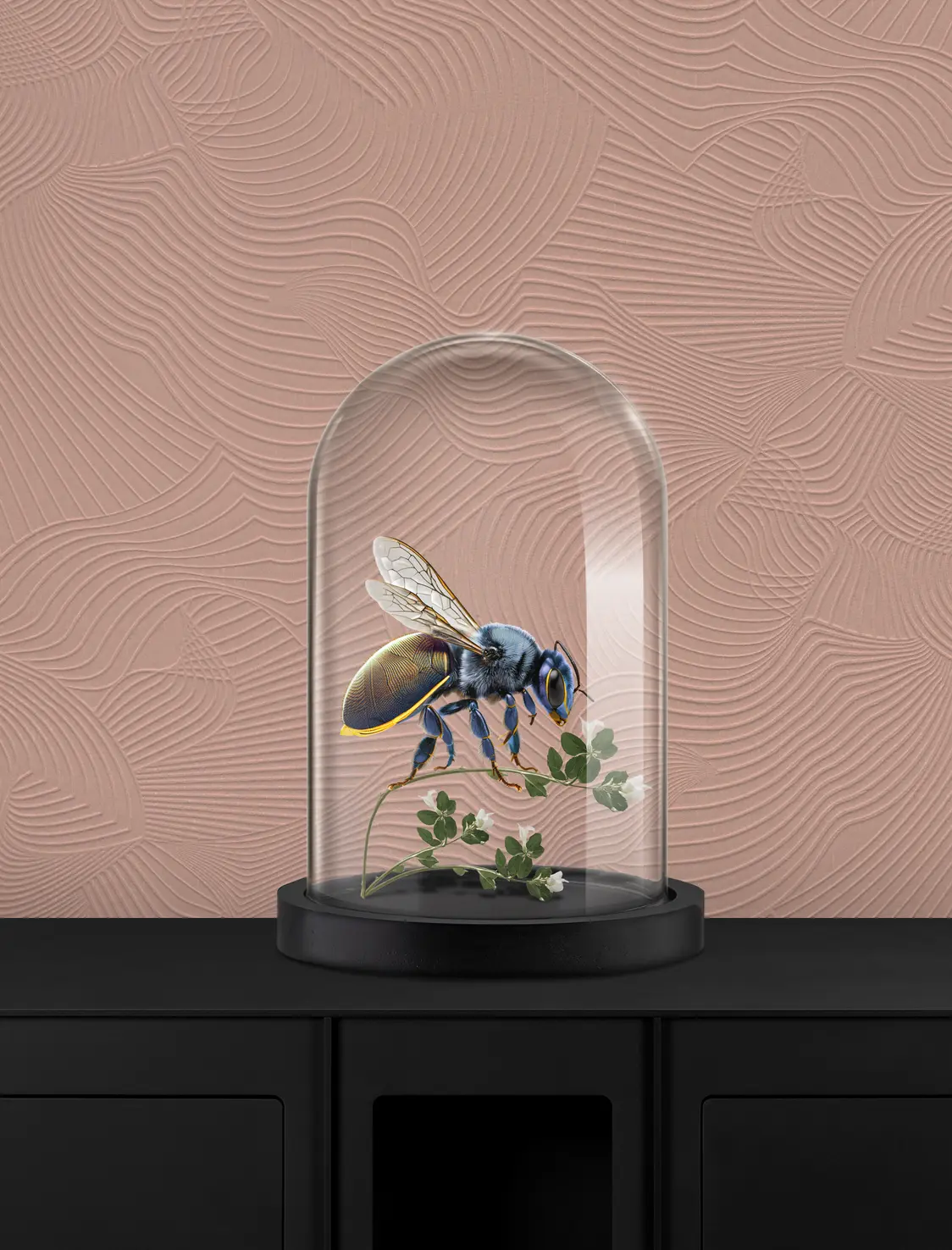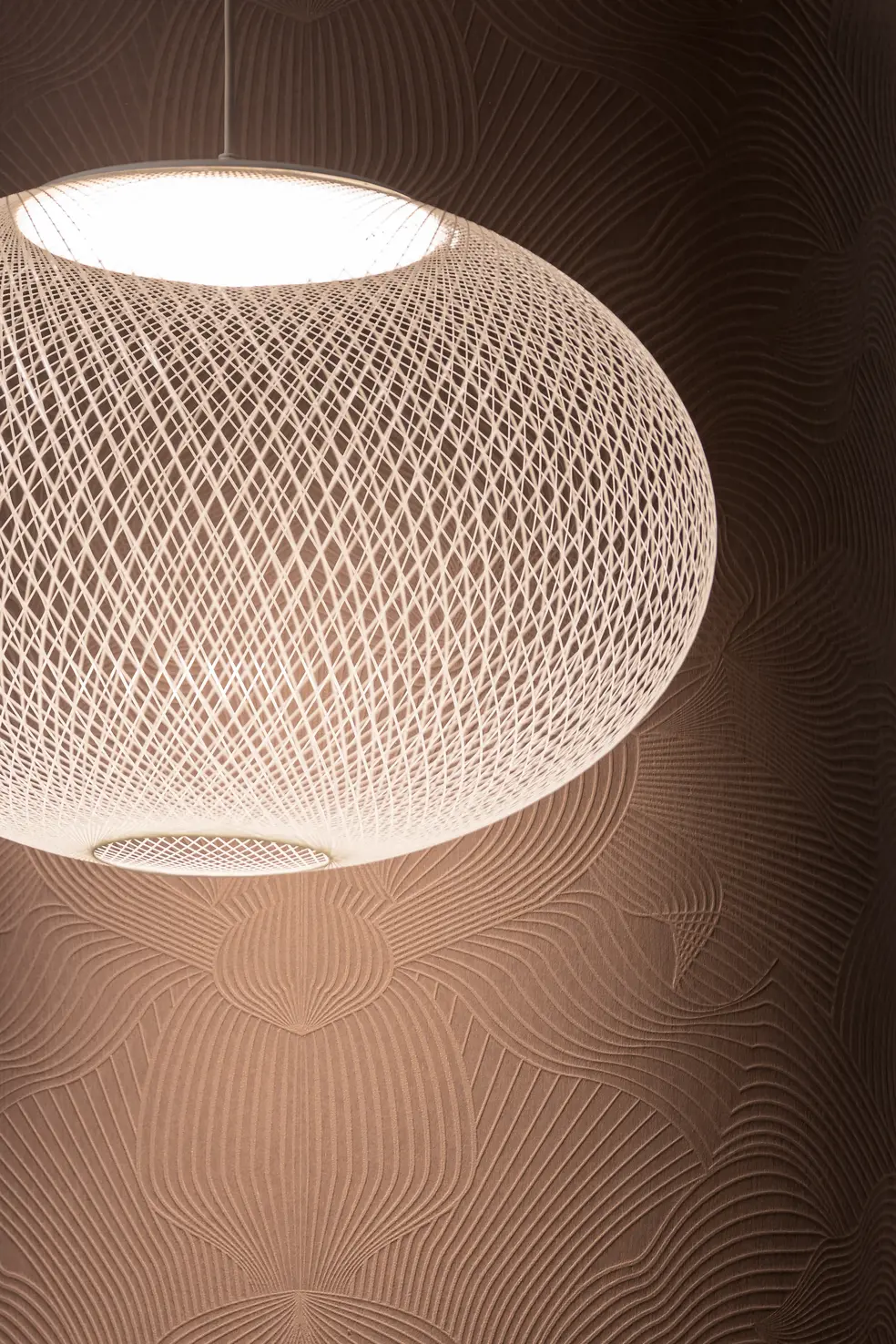 Techno Bee Wallcovering is a 3D textile wall covering on non-woven backing with a distinctive Moiré effect. The wallcovering features a soft gauze textile stretched over a textured relief, revealing the textile’s colour through the grid of the gauzy layer.