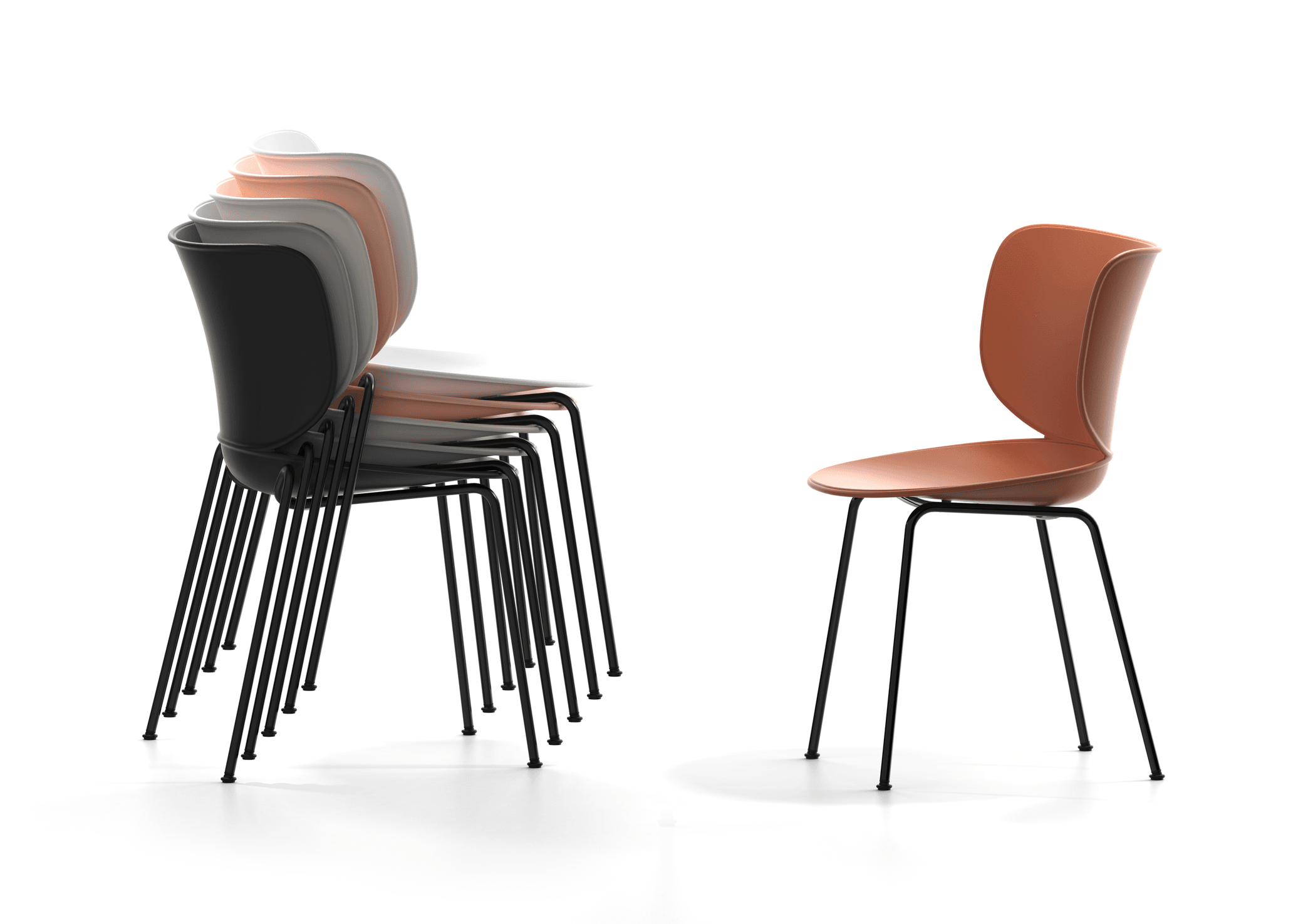 The Hana Chair is available in six colours, can be upholstered, and offers a regular and stackable base in two colours for added versatility.