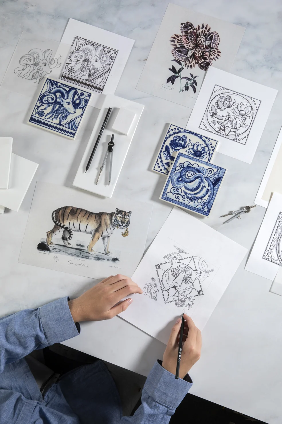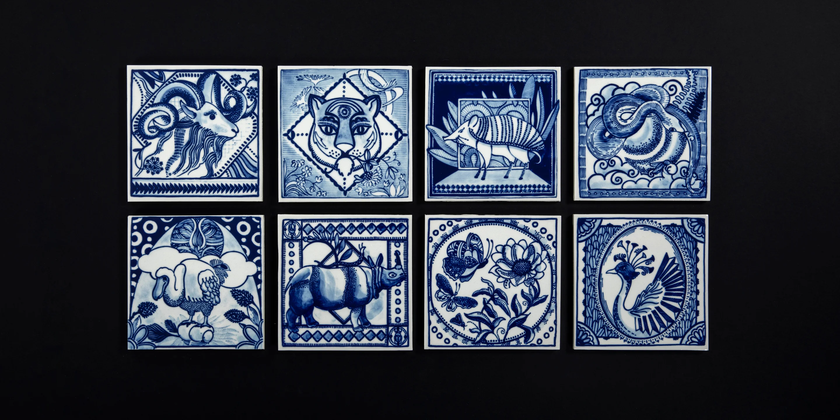 De decoratieve tegels Extinct Animals brengen traditioneel en iconisch Delfts Blauw met een onverwachte moderne twist in je huis.