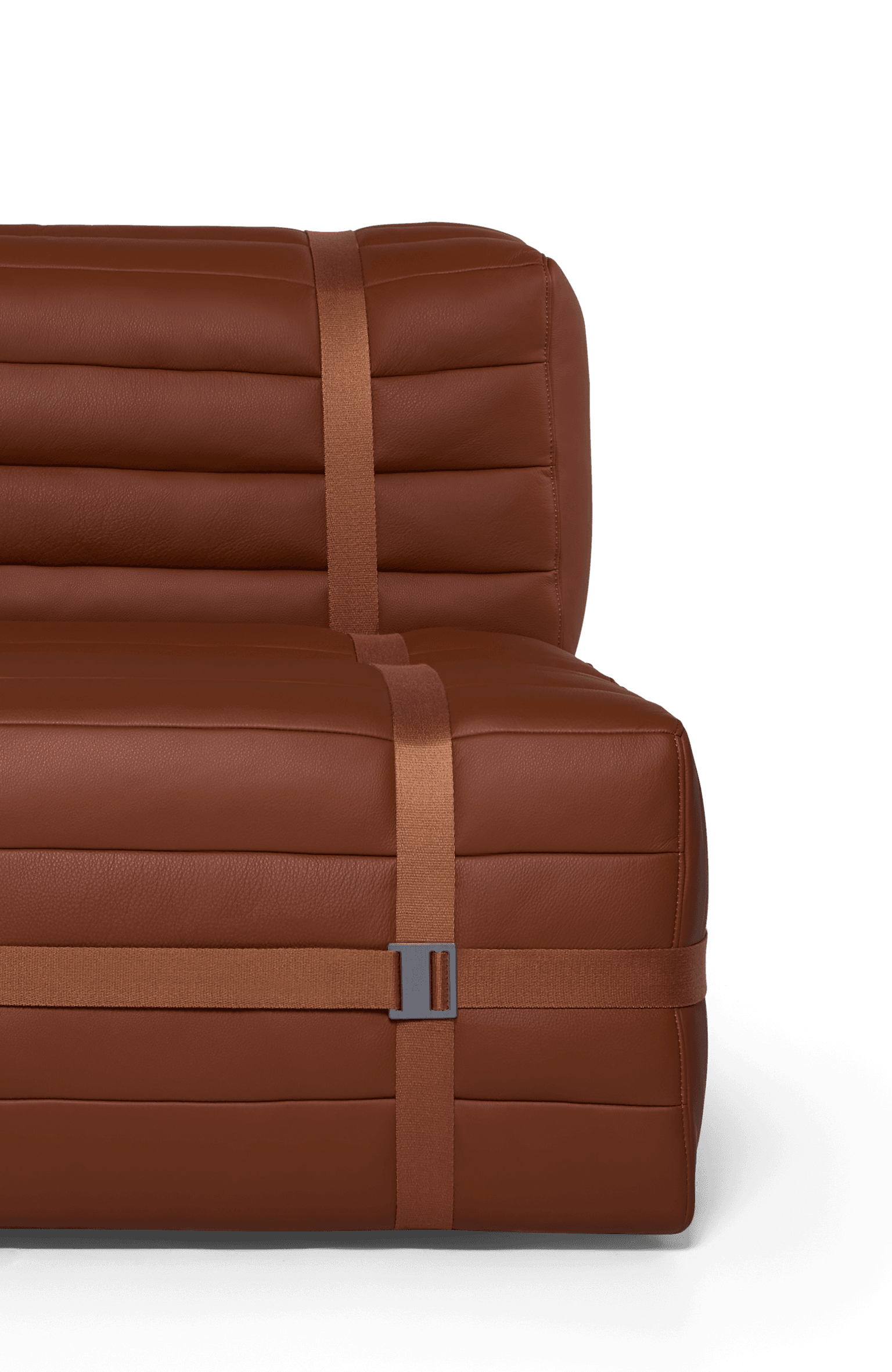 De opvallende banden en doorgestikte kussens geven een rauwe, industriële look en zorgen tegelijk voor ultiem zitcomfort.