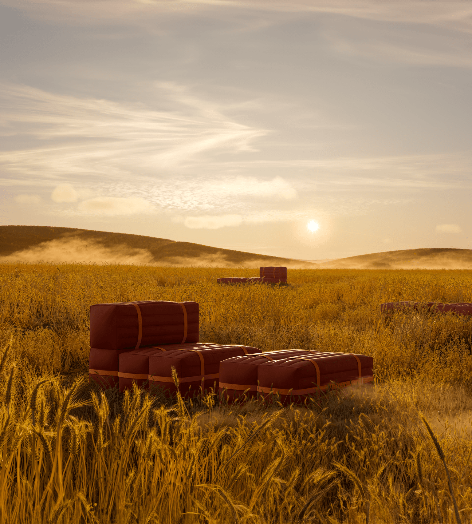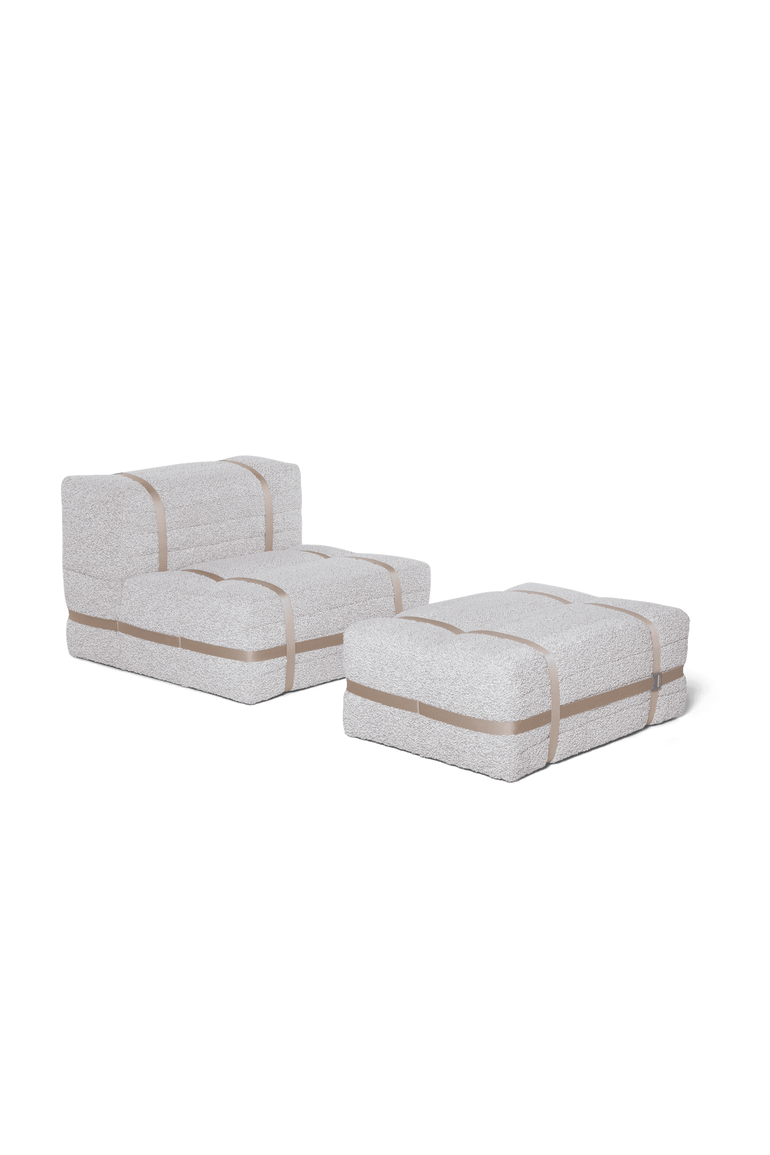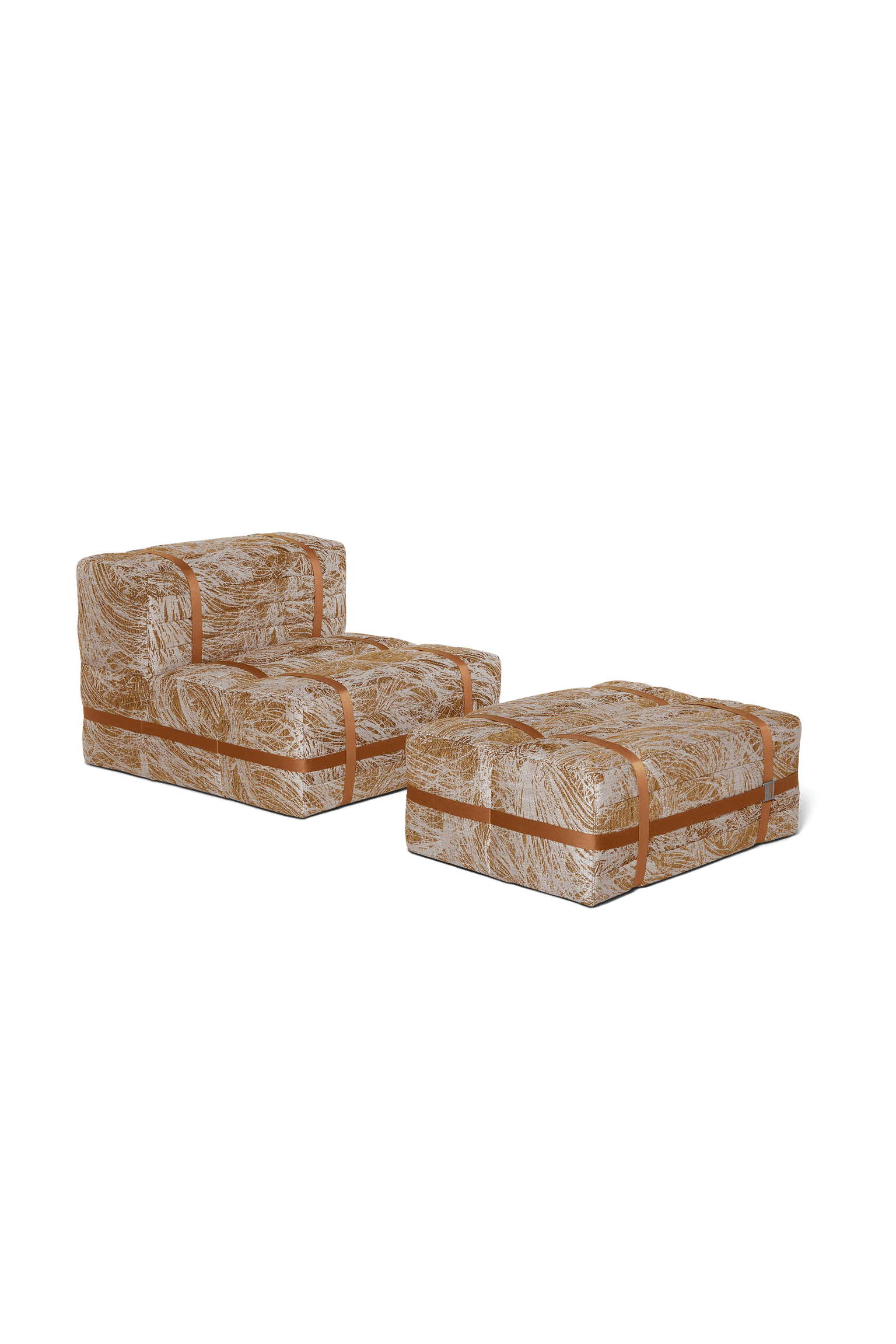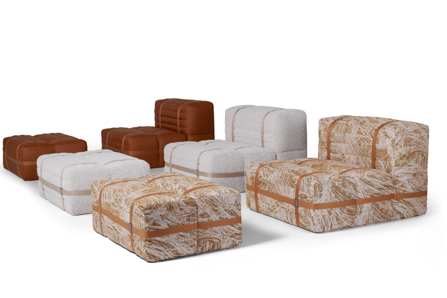 De Haybale Lounge Chair met voetenbank kan op vele verschillende manieren worden opgesteld wat dit ontwerp speels en uitnodigend maakt.