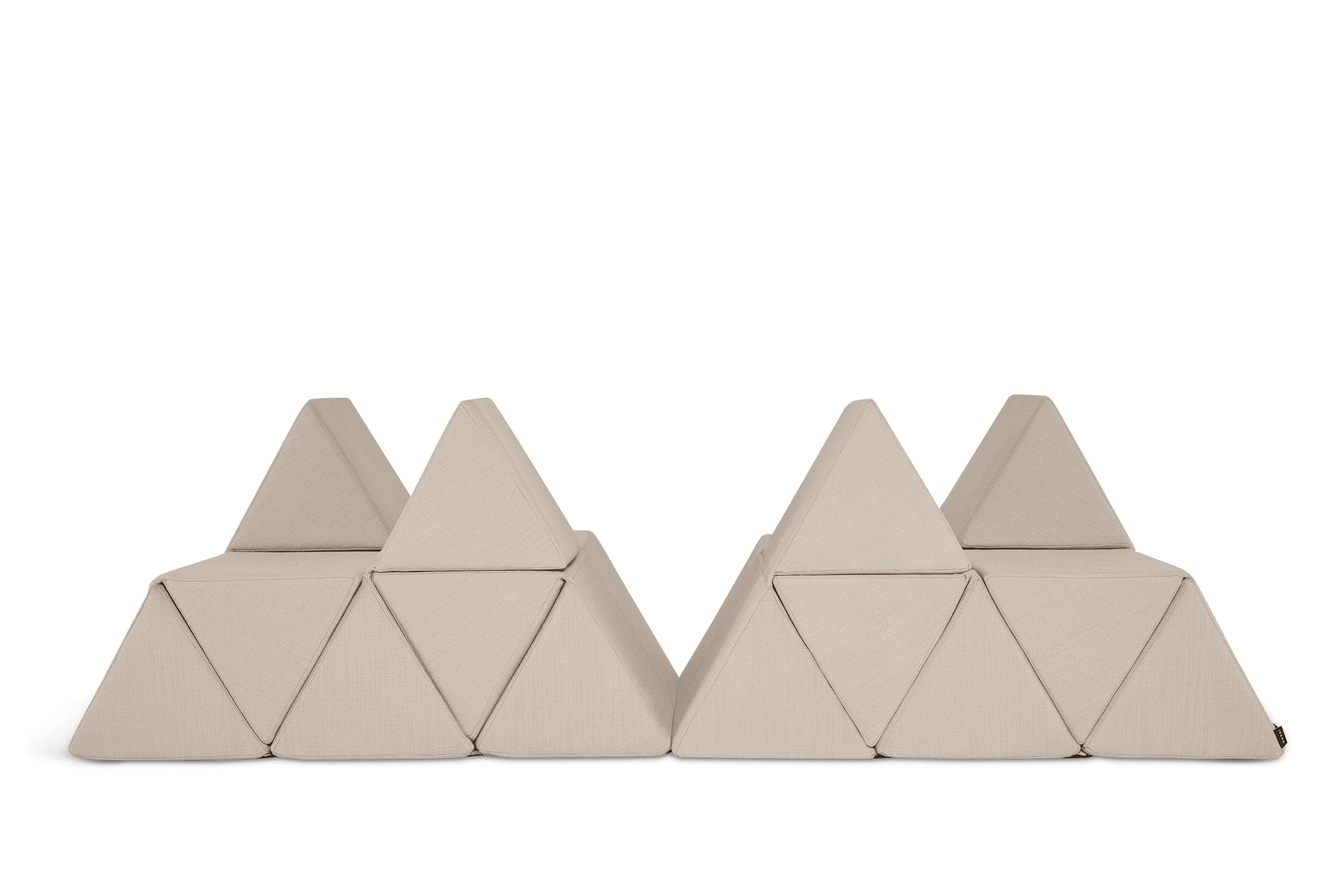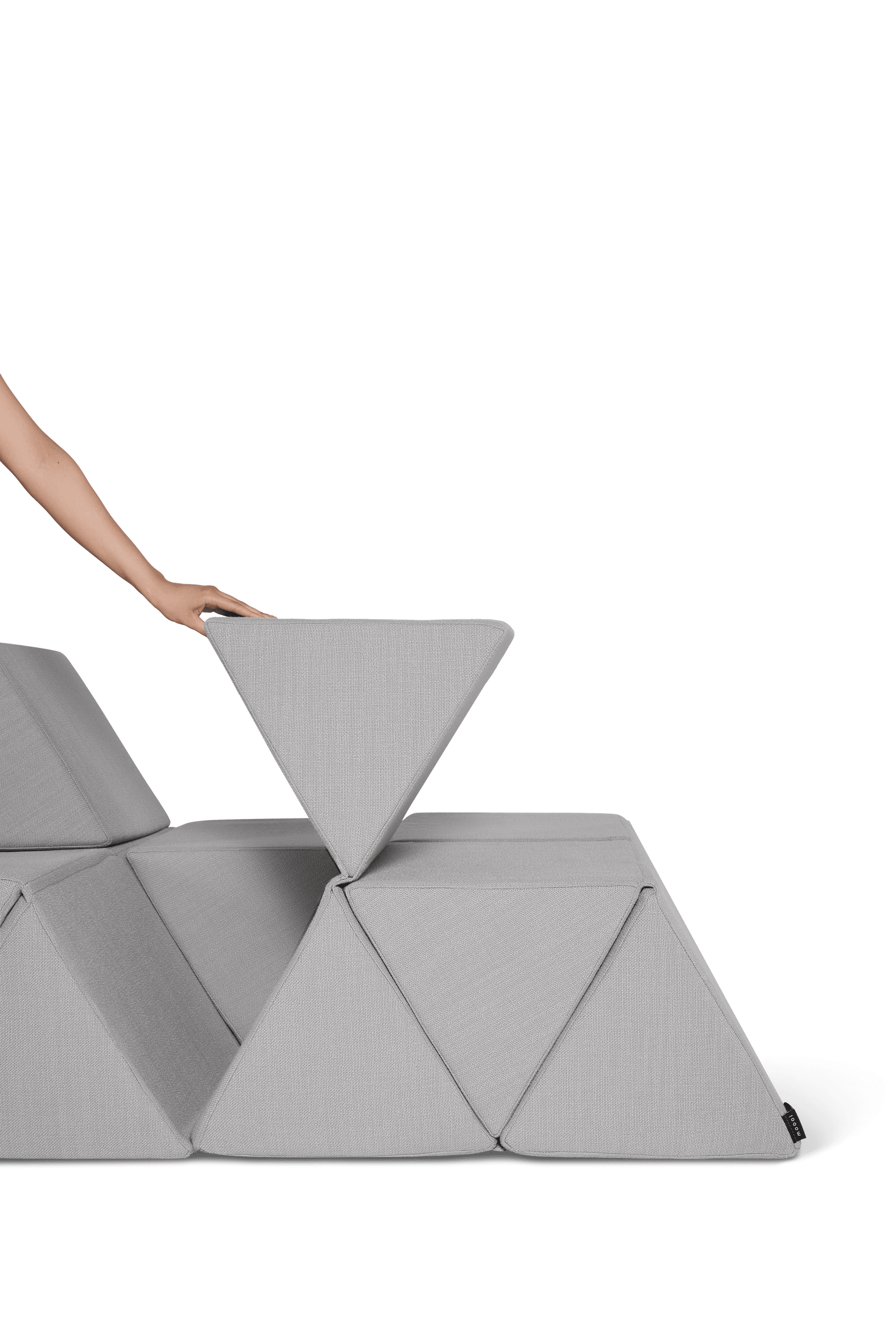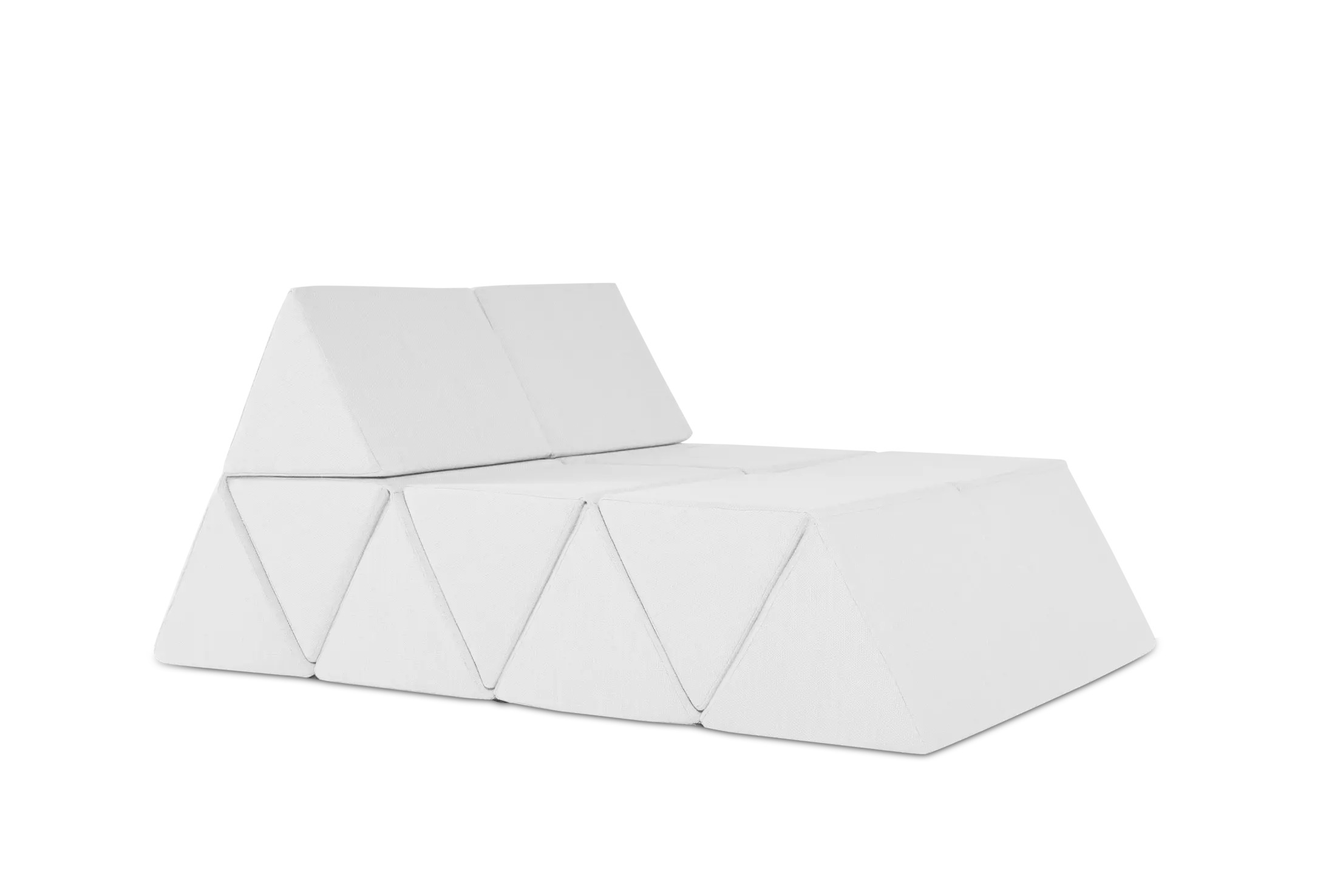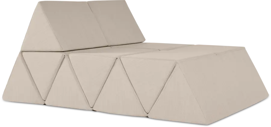 Driehoeken van dubbel schuim vouwen omhoog of omlaag tot een vlakke lounger, schuine rugleuningen of speelse landschappen. In seconden van vorm gewisseld.
