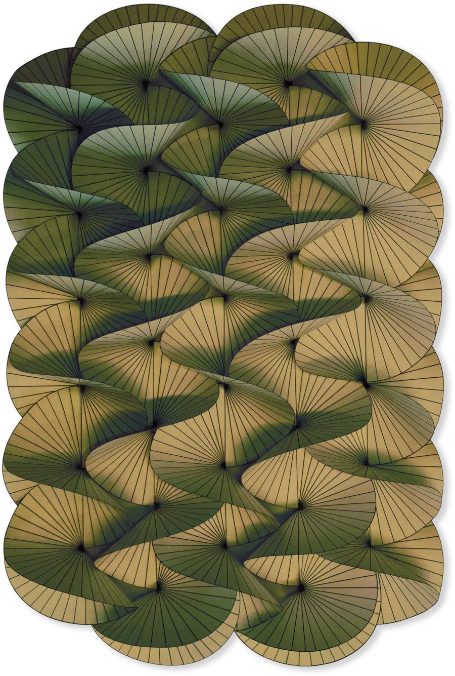 Friemelen met papier en het op allerlei manieren vouwen lag aan de basis van het Serpentine-vloerkleed van Front. Organische en verwrongen vormen die doen denken aan een slangachtige kronkeling. Het materiaal kronkelt vanzelf. Het lijkt op een haast wiskundige manier zijn weg te vinden. Het kleurverloop en schaduwspel scheppen de illusie van een driedimensionaal patroon.