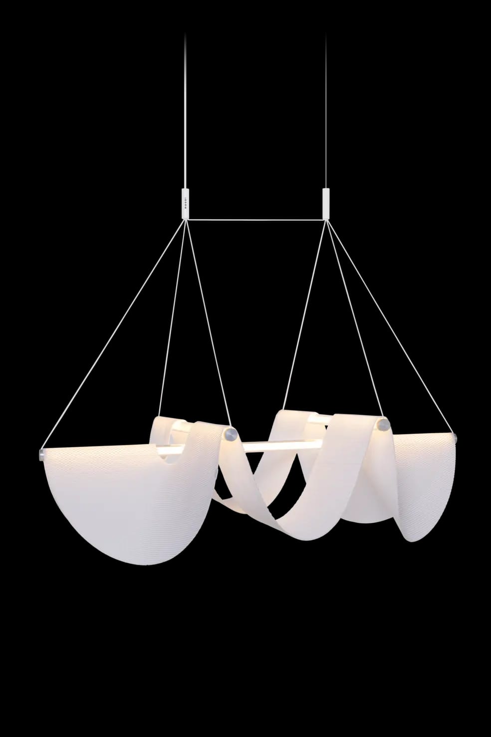 De kap van 3D-gebreid polyester rust op twee minimalistische glazen buizen met daarin ledlampen en heeft een opvallende, organische sculpturale vorm, ontstaan uit zwaartekracht.