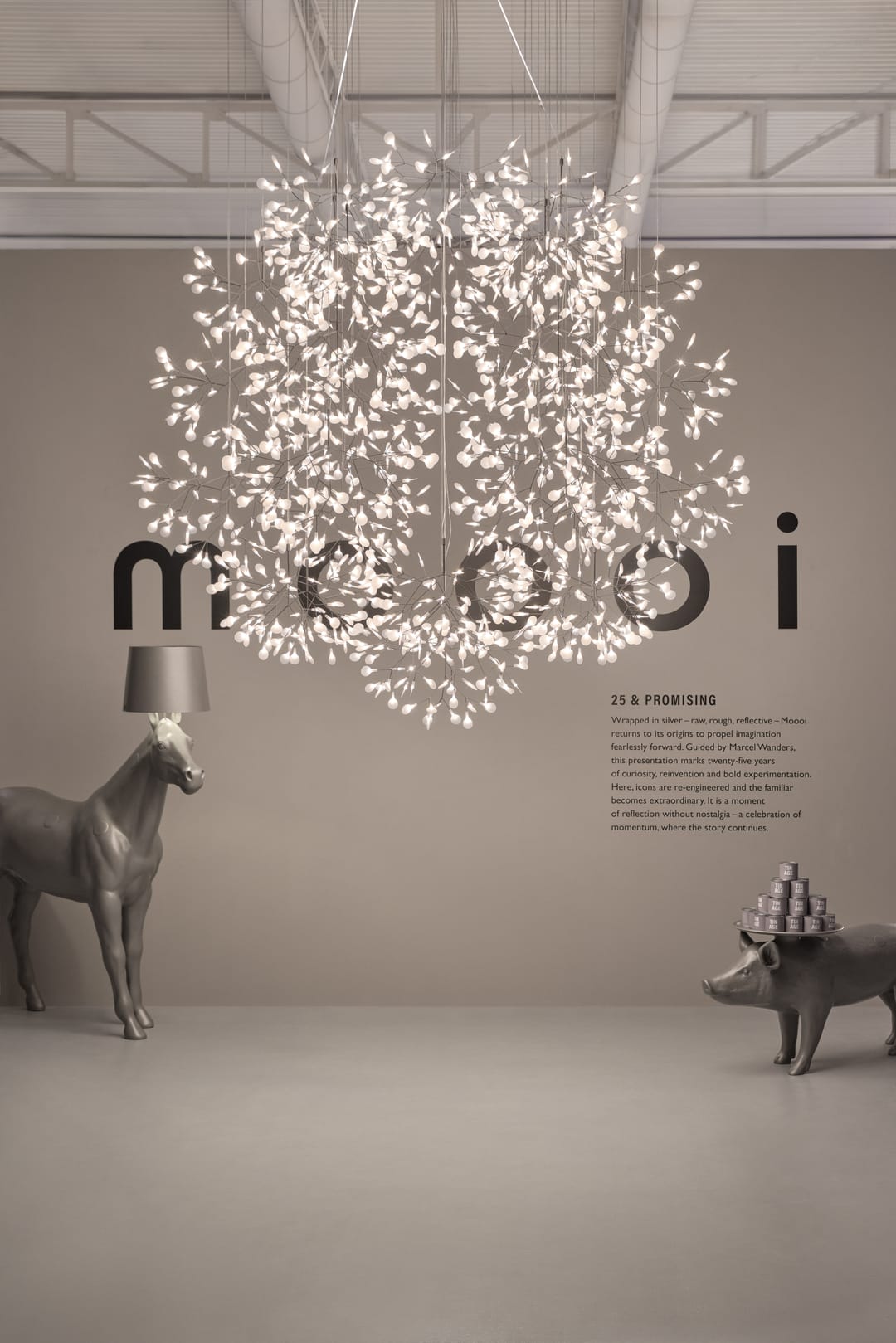 Daarnaast brengen vier op maat gemaakte monumentale mega chandeliers Moooi-verlichtingsiconen samen in gelaagde, sculpturale composities met gedurfde statements van licht, schaal en verbeeldingskracht.