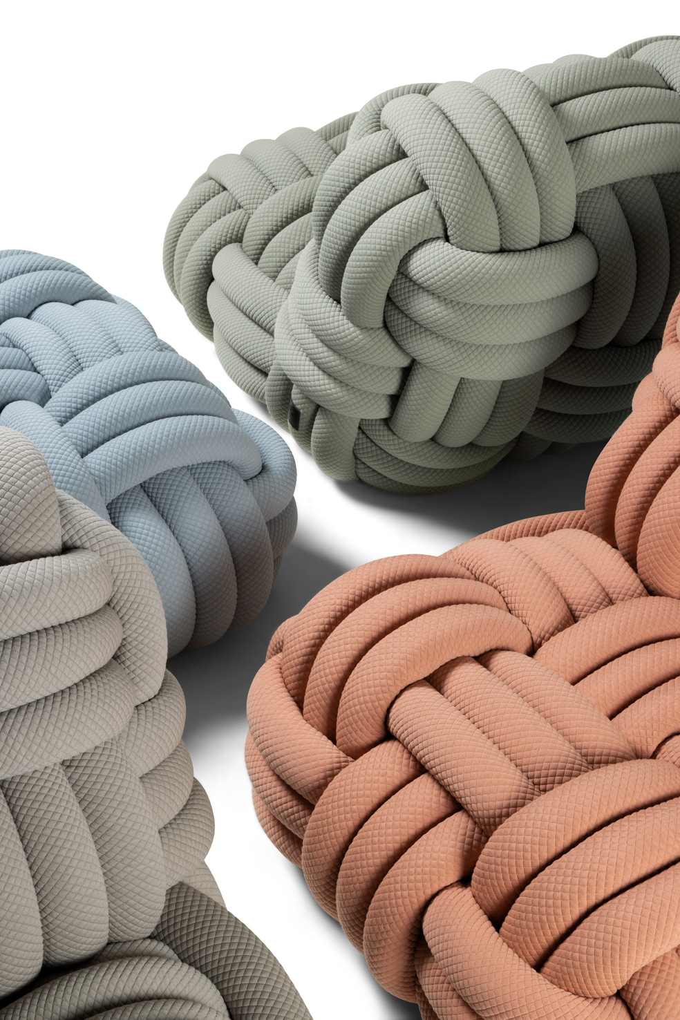 Voor de Knitty-loungestoel liet Nika Zupanc zich inspireren door de enorme scheepsknopen waarmee schepen vroeger aanmeerden. Dit icoon van ontspanning is gemaakt van extra groot ‘garen’ dat eruit ziet als scheepstouw. Het garen is gehuld in een gebreide stof, die een ongeëvenaarde zachtheid oplevert. Het weefpatroon geeft het ontwerp textuur en een voelbare feedback die een unieke mix van volume en soepelheid teweegbrengen. De Knitty-loungestoel is ideaal om lekker in weg te zakken met een boek, naar de zonsondergang te kijken of te dagdromen.