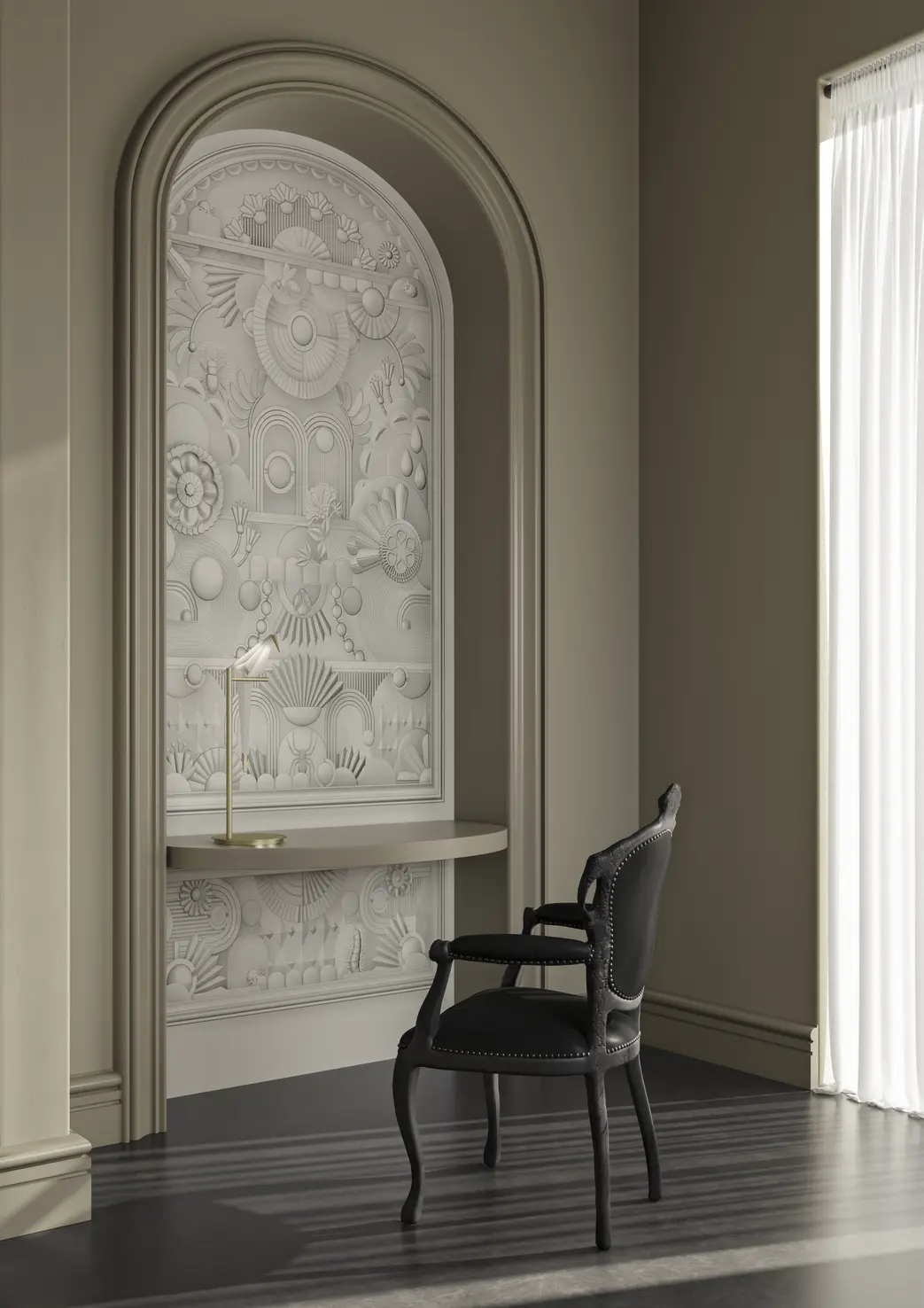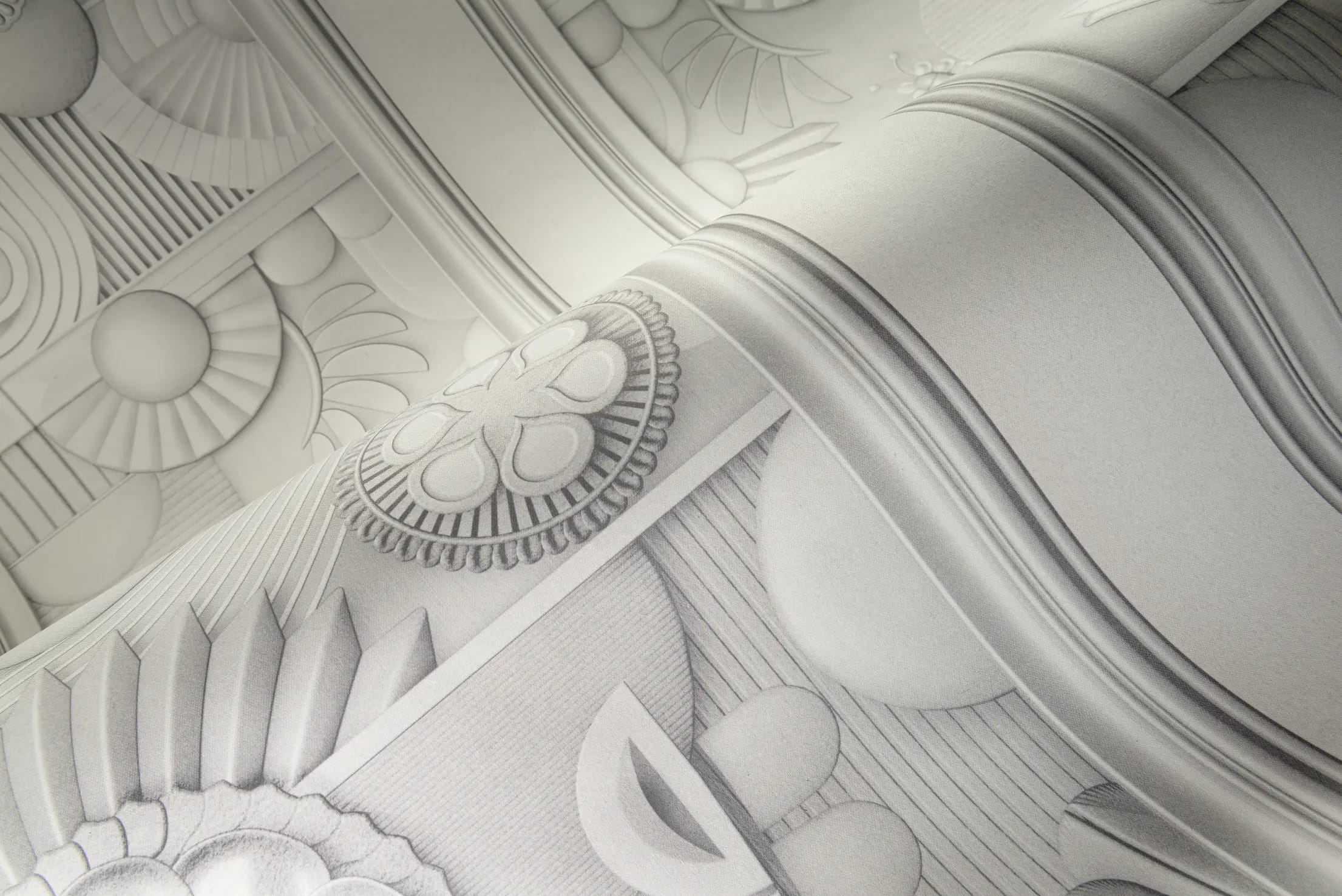 The Greenhouse Gathering Wallcovering is a stunning 3D wall covering that draws inspiration from decorative moulding. The design imitates the sensation of peering through the glass panels of a Green House, uncovering the mesmerising marvels of lush flowers with many intricacies. Infused with the charm of art deco, the Greenhouse Gathering Wallcovering comes in a monochrome palette.