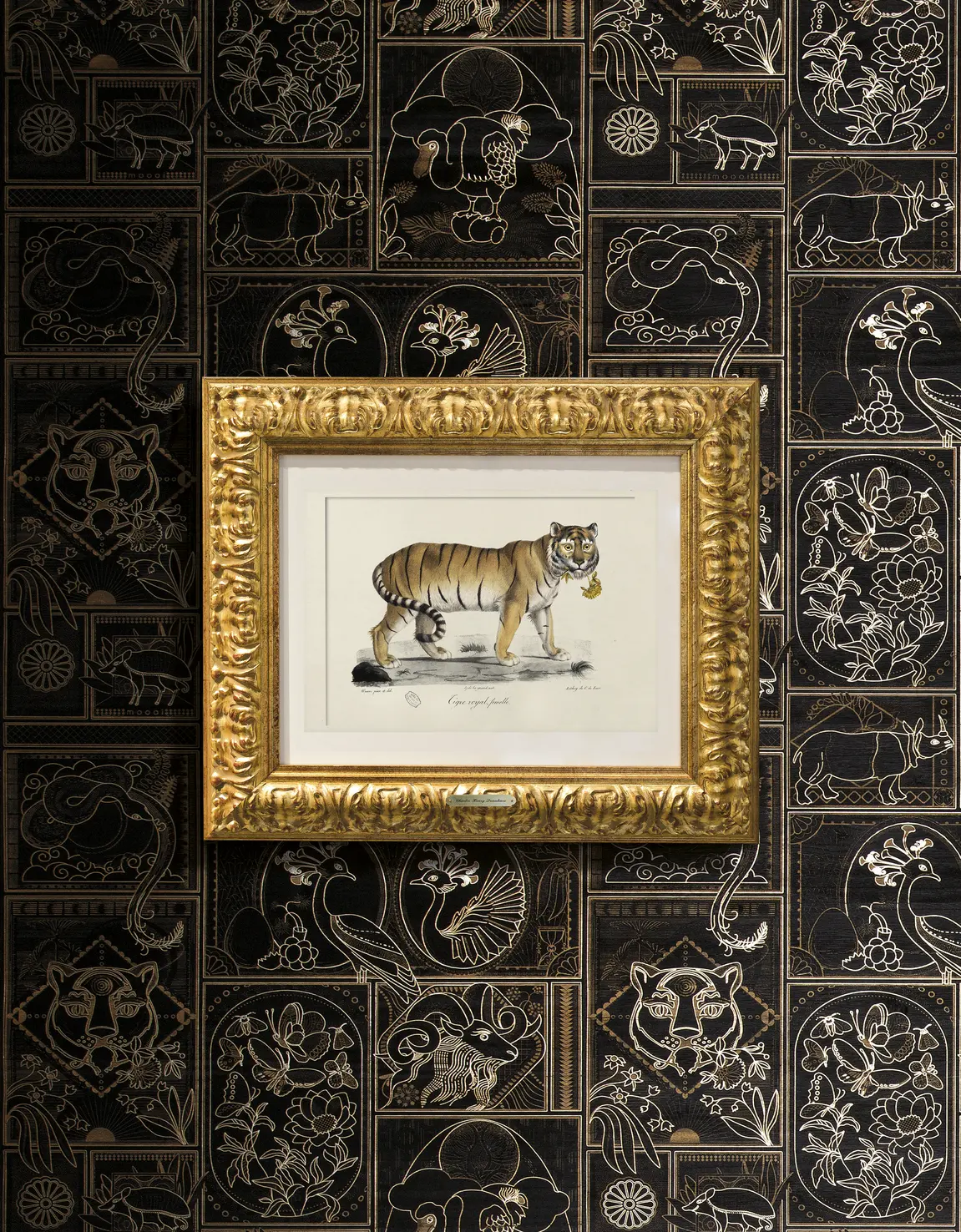 The Golden Tiger Wallcovering made from laser cut wood veneer with gold foil, depicts this friendly Extinct Animal surrounded by his best friends.
