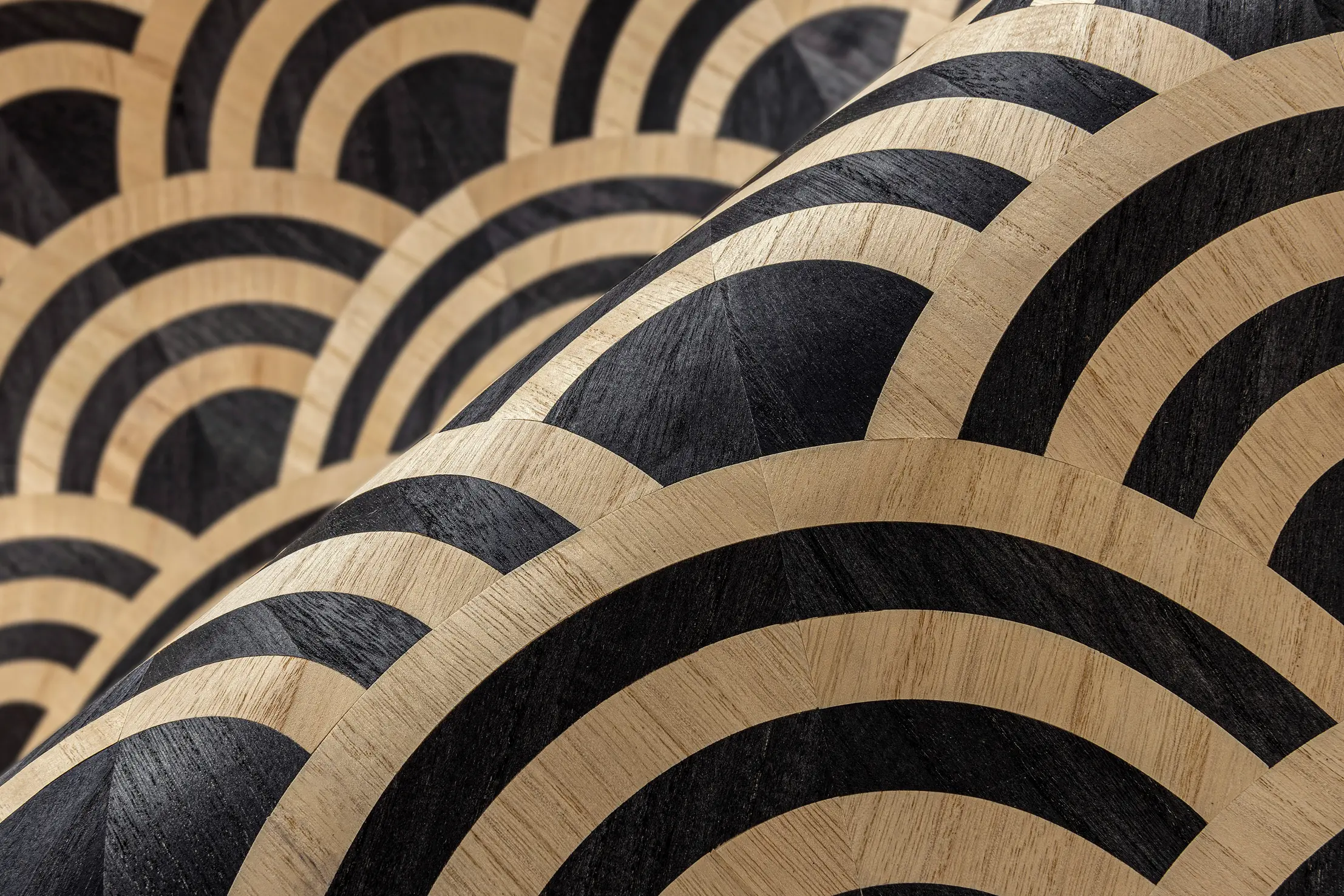 Overlapping O’s, created of wood veneer marquetry inlay, resemble the rolling waves of the ocean. The unique wallcovering’s ancient Seigaiha pattern symbolising waves of water represents good luck, power, and resilience.