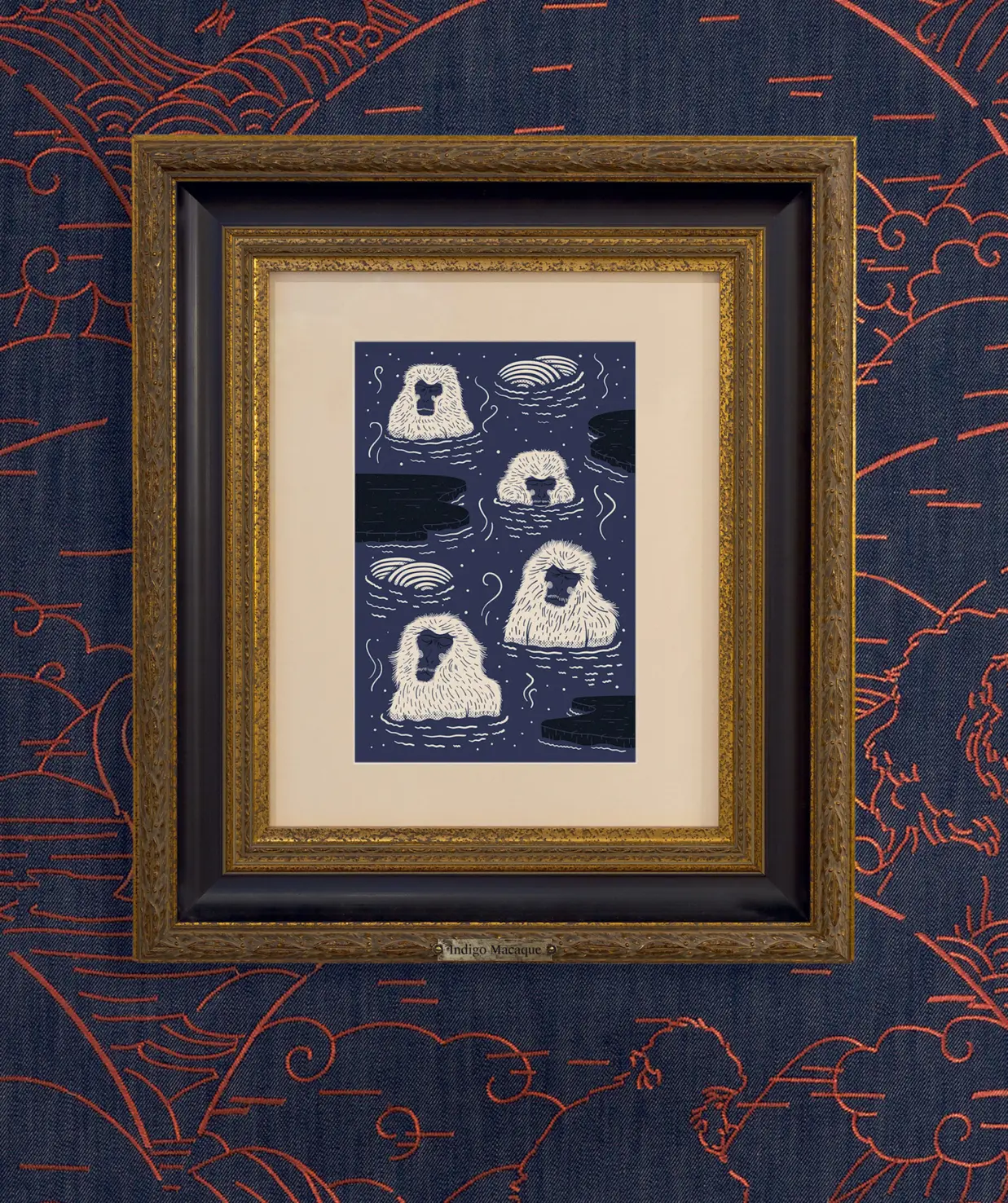 Printed on a soft and velvety finish fabric with denim textures, this lively wallcovering depicts a lush forest brimming with life and movement. Upon closer inspection, Indigo Macaques dressed in traditional kimonos can be discovered between the abundance of exotic flowers.