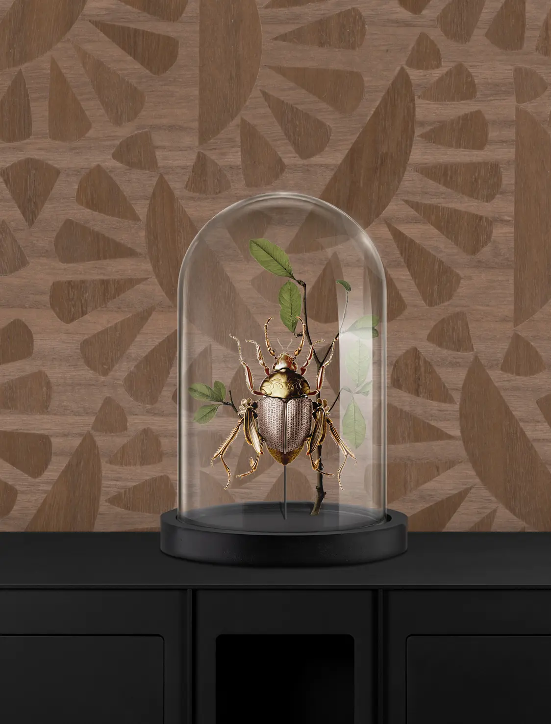 The Woodblock Beetle Flora Wallcovering is a natural wallcovering with a non-woven backing, showcasing the beauty of handmade darker wood veneer inlay. The wallcovering is mono-coloured, but the motifs are thoughtfully arranged in two directions, creating a subtle mix of shades reminiscent of the classic art of marquetry. Available in two colours.
